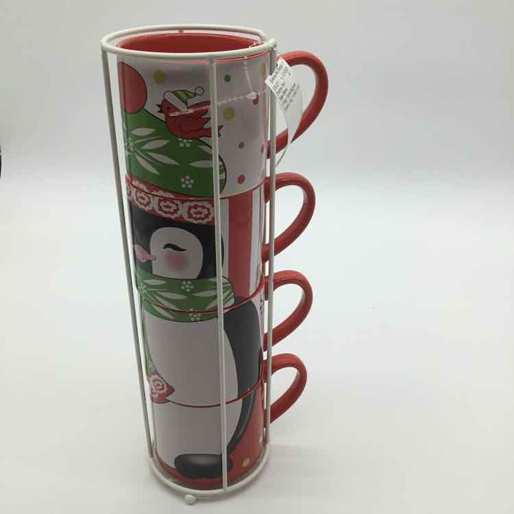 5 Piece Red/white/green Temp-Tations Ceramic Mug In stand Christmas Decor
